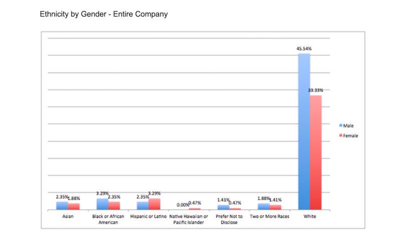 The topline: As a company, Gawker Media is 79 percent white and 57 percent male. In the editorial department, for which I am responsible, the breakdown is 78 percent white, 9 percent African American, 4 percent Latino/a, 4 percent multiracial, 3 percent Asian American, and 1 percent Hawaiian/Pacific Islander. By gender, 62 percent of editorial staffers are male, and 38 percent are female. The data is gathered from forms filled out by new hires; in anticipation of the publication of this data, all editorial staffers were recently asked to update their human resources information to ensure accuracy. Two percent declined to identify with any ethnic category.